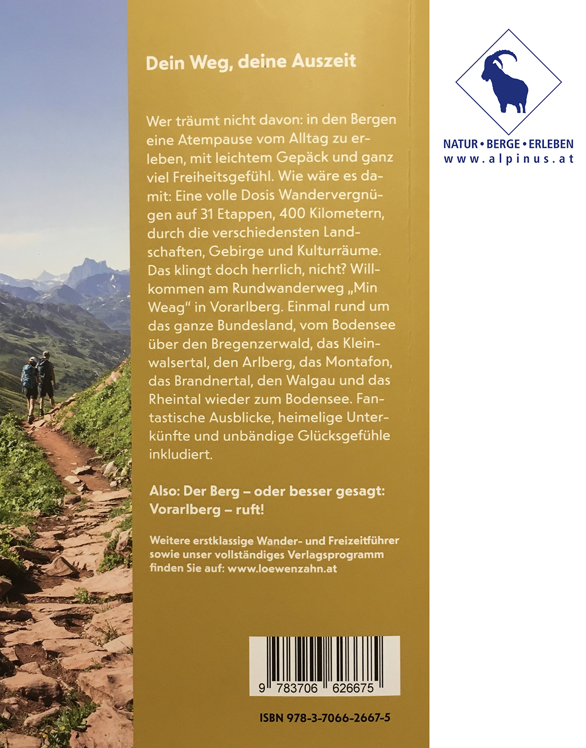 Im Frühjahr 2020 hat Vorarlberg Tourismus den neuen Wanderführer zum Vorarlberger Weitwanderweg "Min Weag" veröffentlicht. „Min Weag“ führt in 31 Etappen über 400 km und insgesamt 23.000 Höhenmeter im Auf- und Abstieg vom Bodensee, durch den Bregenzerwald, an den Arlberg, weiter zu den Gipfeln der Silvretta im Montafon und durch das Rätikon wieder in Richtung Rheintal zurück zum Bodensee.